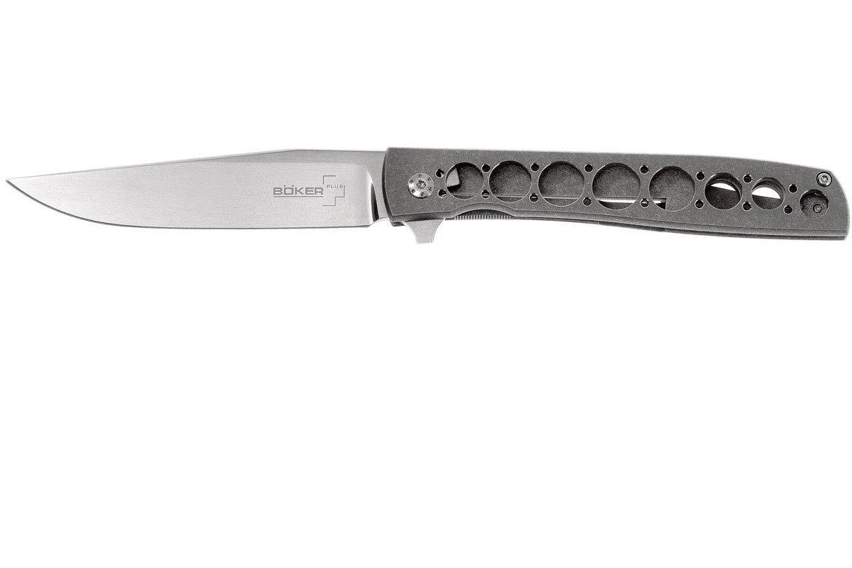 Le Böker Plus Urban Trapper Grand est un couteau de poche mince et élégant signé Brad Zinker. Son cadre en titane et sa petite taille en font un couteau très léger. On ouvre le couteau facilement d’une main grâce au flipper. Le dos de la lame en acier VG10 est magnifiquement arrondi. Un framelock maintient la lame solidement en position ouverte. Avec le clip de poche « deep-carry », vous pouvez transporter discrètement l’Urban Trapper Grand sur vous. Un couteau de gentleman idéal à un prix très intéressant.