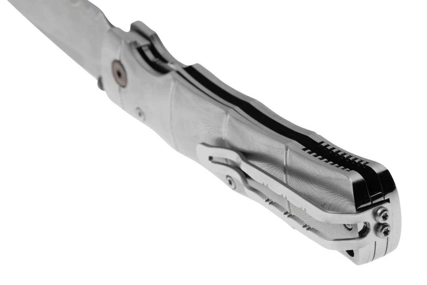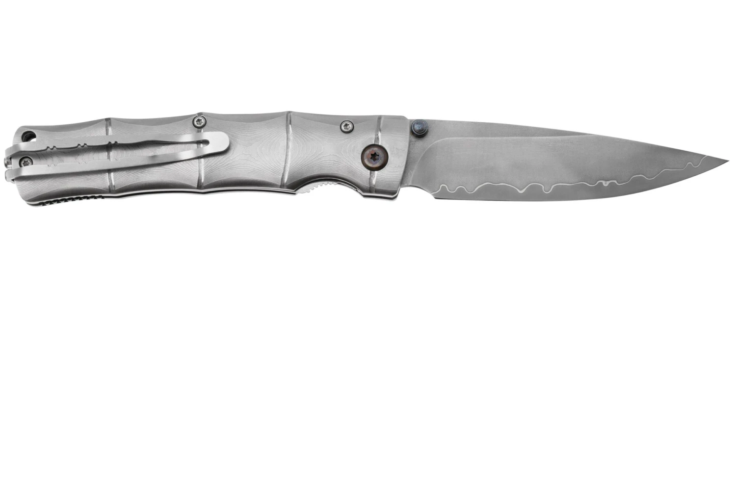 Le Mcusta MC-0202G Shinra Maxima Takeri est un grand couteau de poche très élégant. Parfait pour ceux qui ont une préférence pour les grands couteaux de gentleman. Le manche en acier damassé est incroyable. Mcusta a doté le manche d’une texture bambou. On a donc la sensation d’avoir un manche fabriqué à partir d’un vrai morceau de bambou. Non seulement c’est magnifique mais cela ajoute également une bonne adhérence.