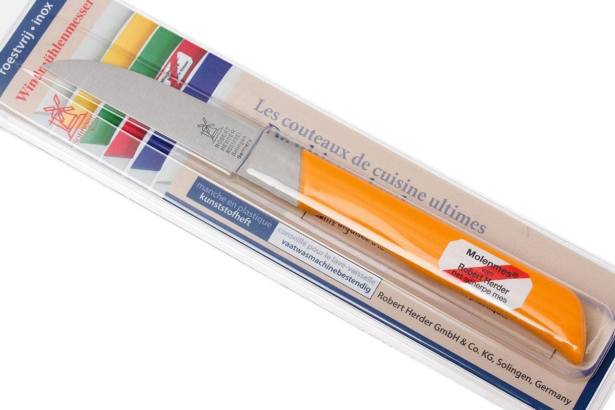 Le couteau à éplucher Robert Herder straight classic 1966 jaune s’inscrit dans la lignée des célèbres couteaux de moulin de Robert Herder. Le couteau à éplucher est idéal pour éplucher les légumes et les fruits. Il convient également pour couper le poisson et la viande. Le manche en plastique polypropylène offre une excellente prise en main. La lame en acier inoxydable est aiguisée à la main selon la technique traditionnelle « Solinger Dünnschliff ». En résulte une lame tranchante comme un rasoir.