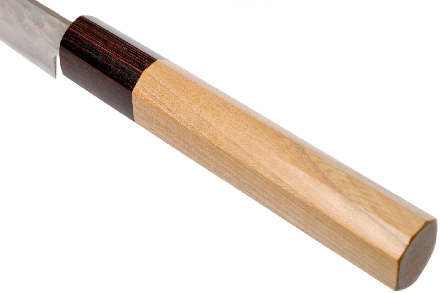 Ce couteau universel Sakai Takayuki 15 cm de la gamme 33-layer VG10 Damascus Hammered WA est l’homme à tout faire des couteaux de cuisine. Vous pouvez l’utiliser pour hacher finement les herbes, couper les légumes ou même la viande.
